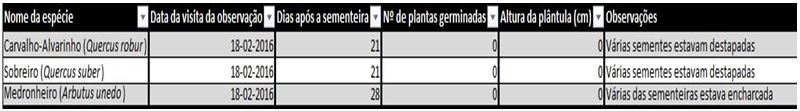 Tabela de Registo da Sementeira